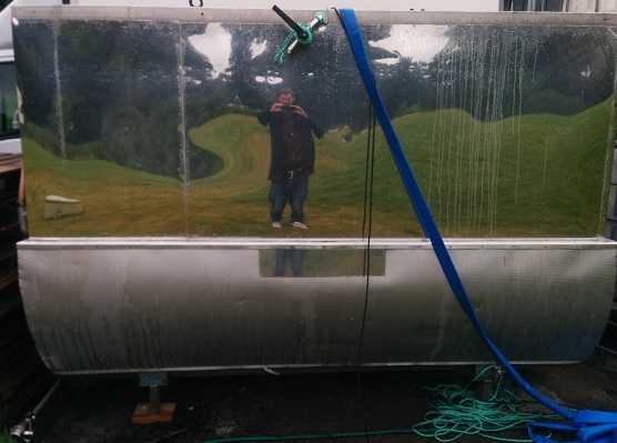 I rostfritt med inlopp för hetvatten. 300 cm lång, 30 cm bred. Tillhörande drivmotor. Uttag för sköljvatten. Pris: 16 000 kr